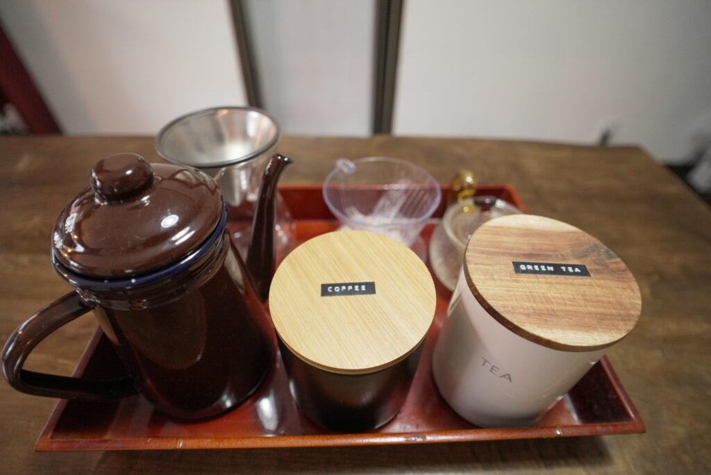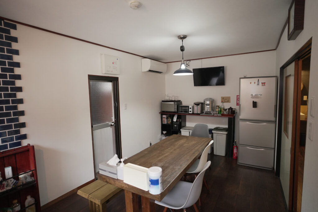The kitchen is equipped with a refrigerator, freezer, IH stove, a variety of dishes, cookware, and seasonings. Free drinks are also available, including drip coffee and tea bags.